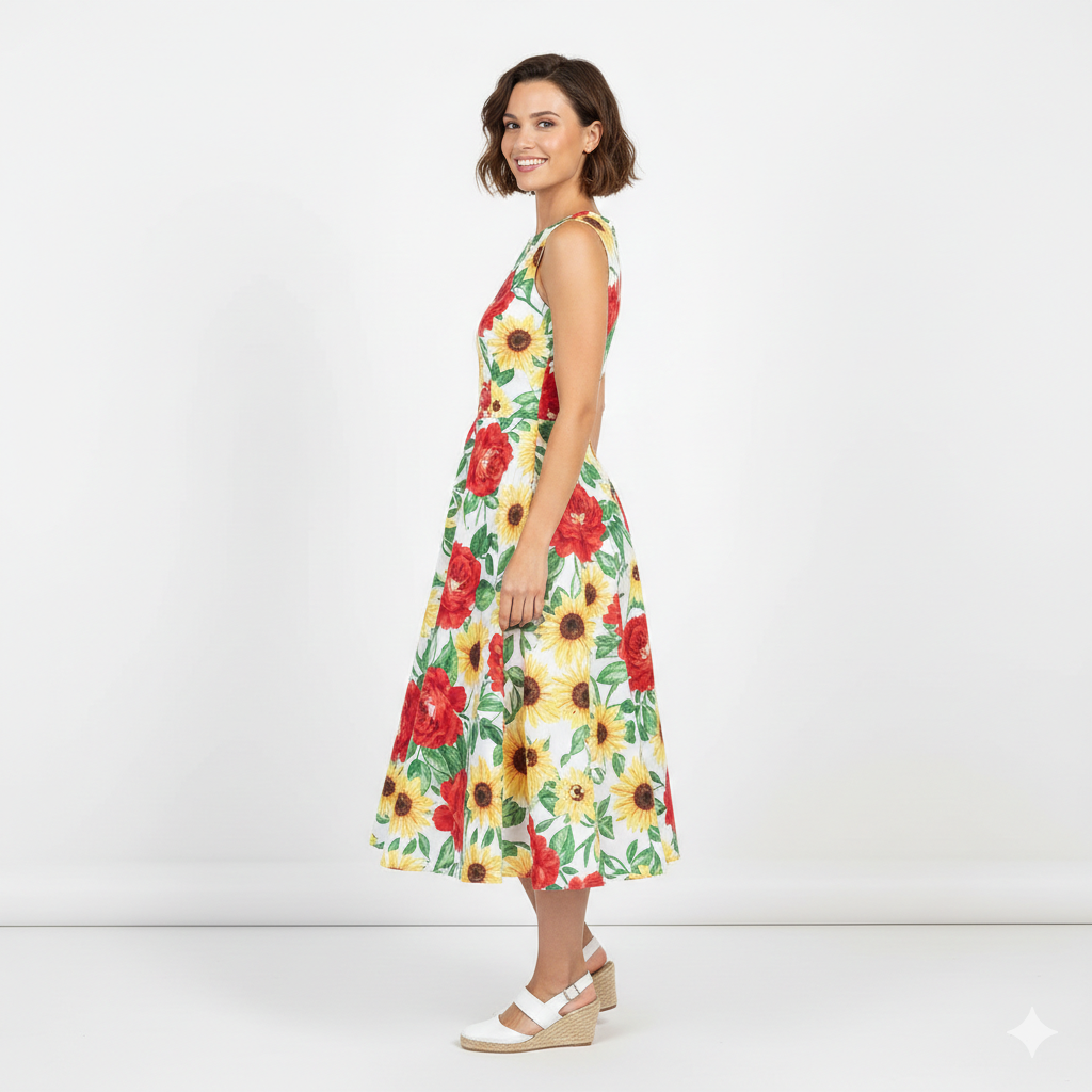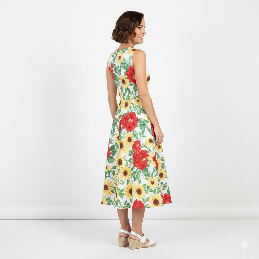 The sleeveless bodice offers a flattering, tailored fit, while the cinched waist flows into a full, twirl-worthy midi skirt that moves gracefully with every step. Crafted from lightweight, breathable fabric, it’s perfect for daytime gatherings, brunches, garden parties, or summer strolls.
