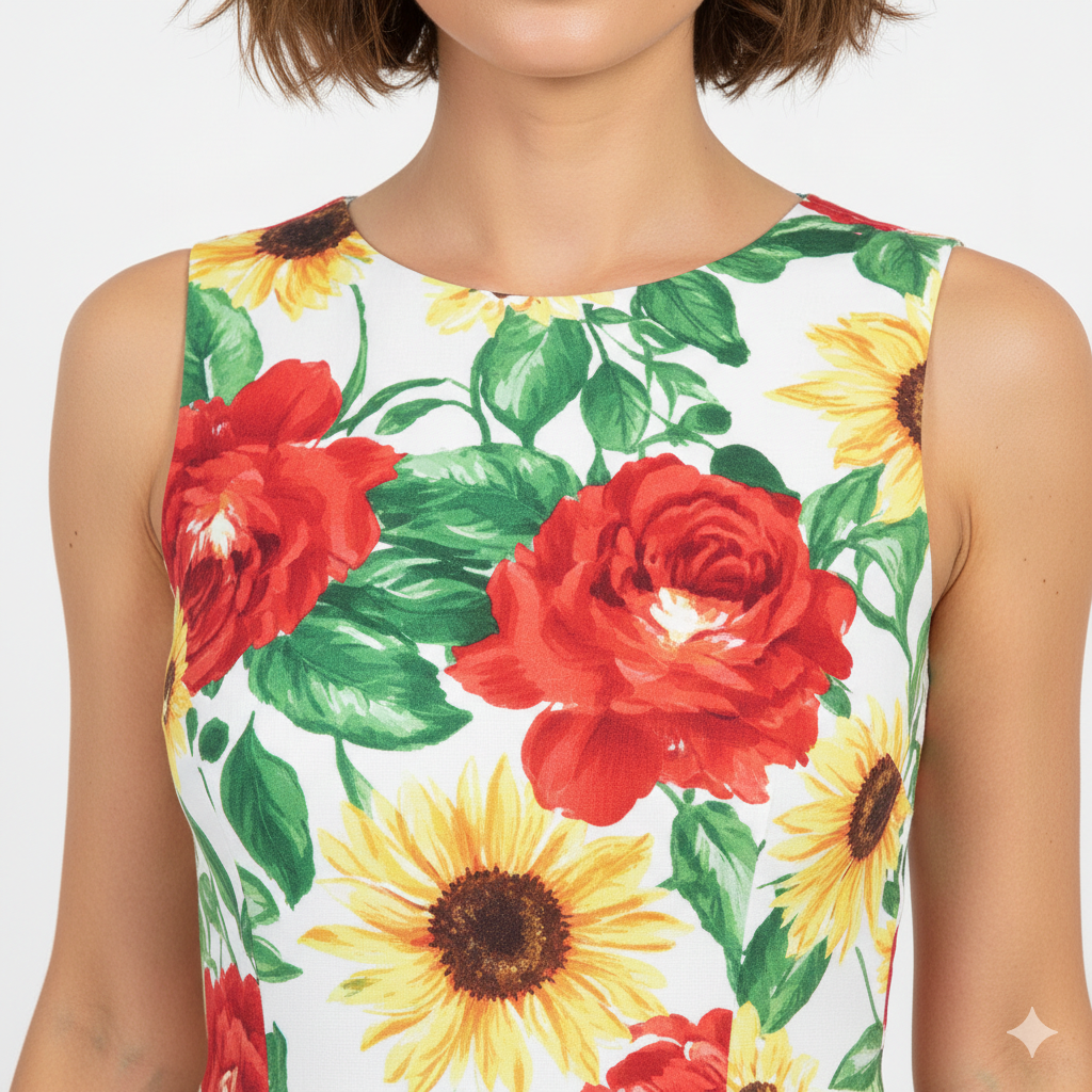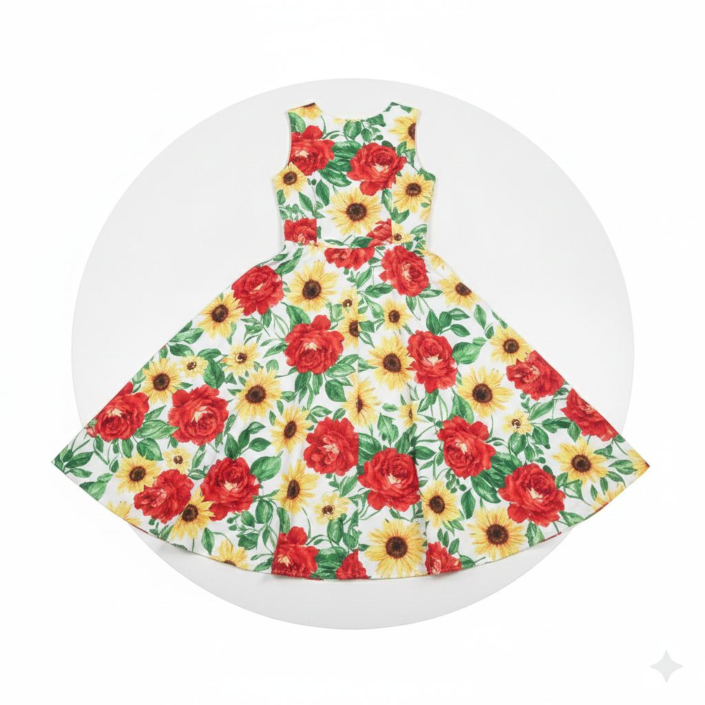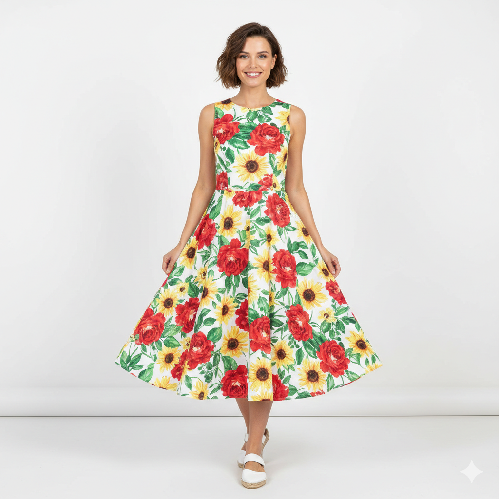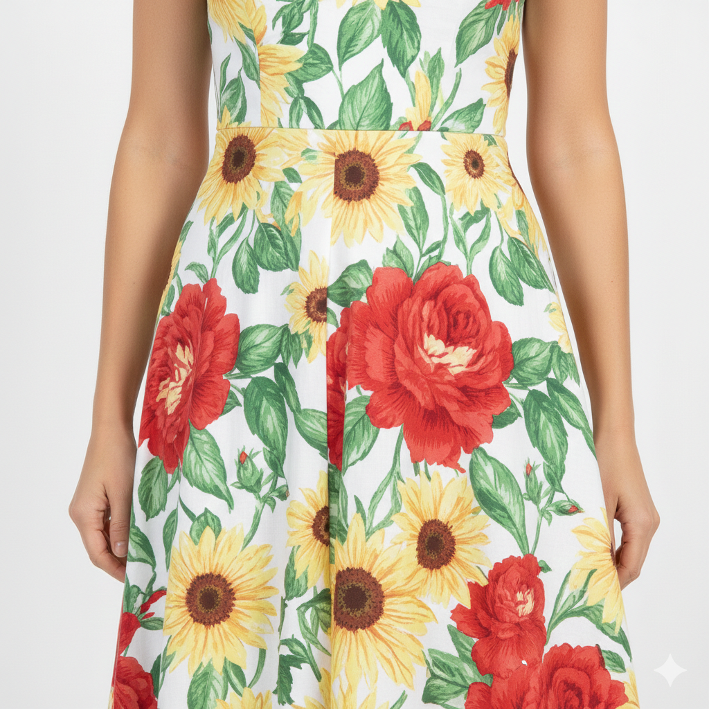 Bright, joyful, and effortlessly feminine – the Sunblossom Garden Midi Dress is designed to turn everyday moments into something beautiful. Featuring a vibrant floral print with bold red blooms and sunny yellow blossoms set against a soft cream backdrop, this dress radiates warmth and charm.