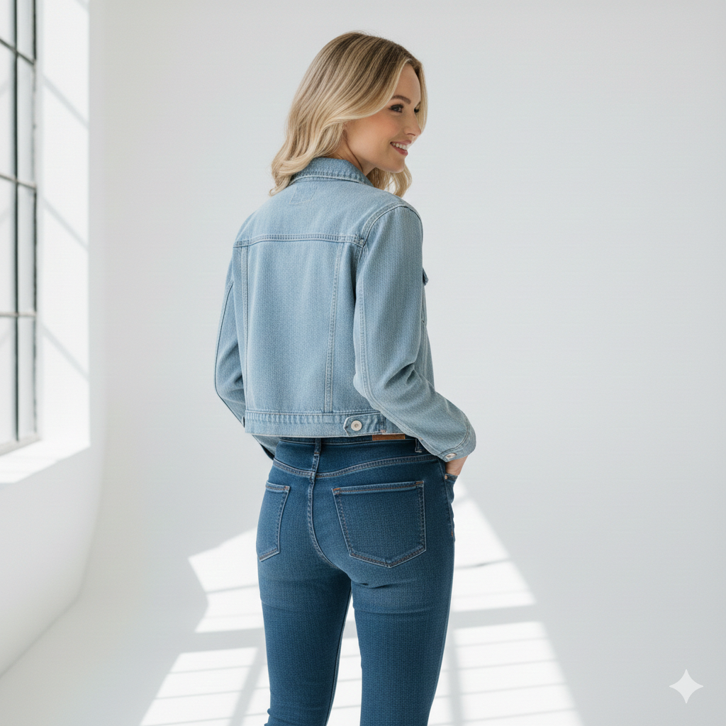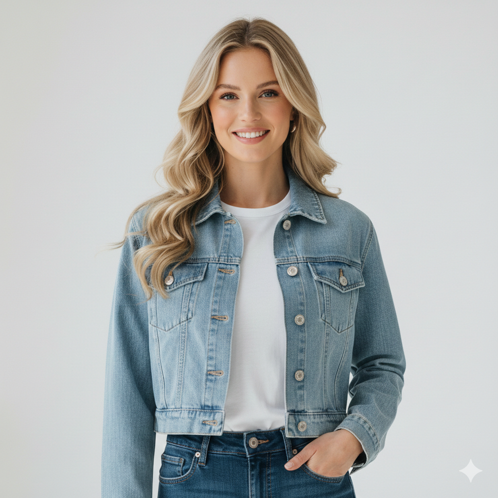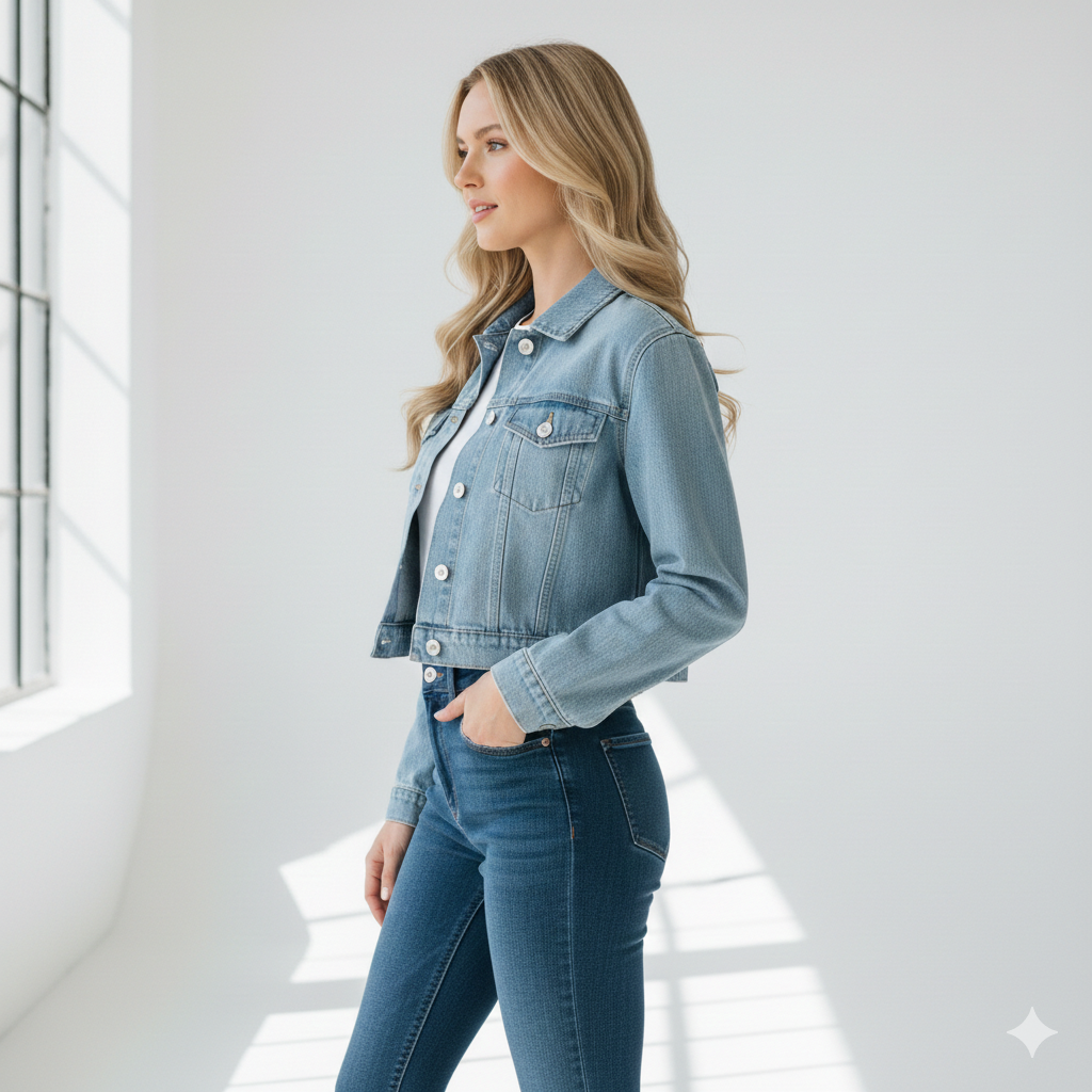 Playful, modern, and effortlessly stylish – the Chic Cropped Denim Jacket is a fresh take on a timeless classic. Designed with a flattering cropped length, it highlights the waist and pairs perfectly with high-rise jeans, dresses, or skirts for a balanced, fashion-forward look.